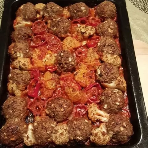 Приготовление начинается с объединения фарша с мелко нарезанным луком и четвертью капусты. К этому добавляются дробленая пшеница, яйцо, а также соль и перец, после чего все тщательно перемешивается. На предварительно смазанном маслом противне формируются «колобки», между которыми размещаются цветная капуста и болгарский перец. Сверху укладываются кусочки лука для дополнительного аромата.