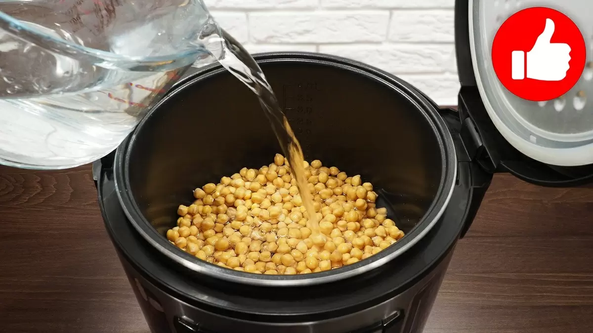 После отмочки необходимо аккуратно потереть нут руками, чтобы избавиться от лишней кожицы, а затем тщательно промыть под проточной водой. Промытые зерна помещаются в чашу мультиварки, куда добавляется свежая вода.