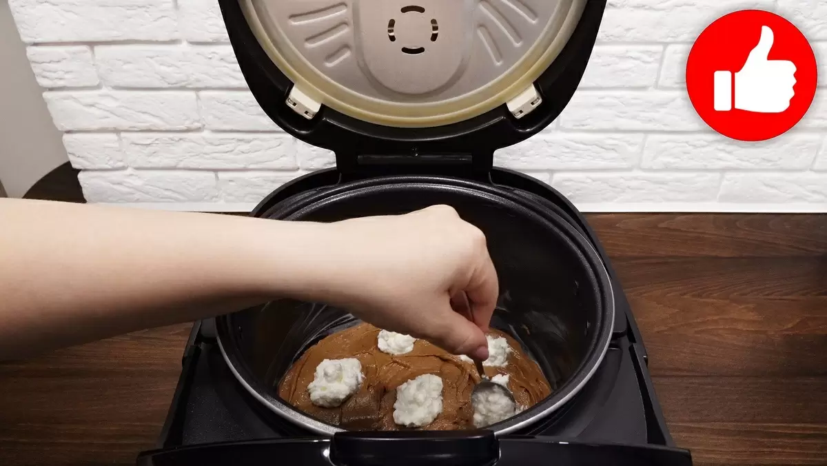 В получившуюся массу постепенно вводится мука, какао-порошок и разрыхлитель теста, создавая однородное тесто. Чаша мультиварки предварительно смазывается маслом для предотвращения прилипания. На дно выкладывается половина теста, а сверху — творожная начинка. Залейте оставшееся тесто и аккуратно распределите его.