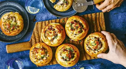 Мягкие булочки приобретают особую привлекательность благодаря начинке, которую можно изменять в зависимости от предпочтений. Чтобы приготовить тесто, достаточно смешать теплую воду с сахаром и дрожжами, оставить на некоторое время, а затем соединить с мукой, солью и оливковым маслом. Тесто должно увеличиться в объеме, после чего его раскатывают, смазывают томатным соусом и укладывают начинку. После сворачивания в рулет, тесто нарезается на порционные куски и выкладывается на противень.