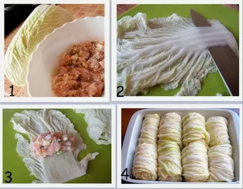 - Срезается утолщение у основания каждого листа, после чего на них выкладывается приготовленная начинка и происходит формирование голубцов.