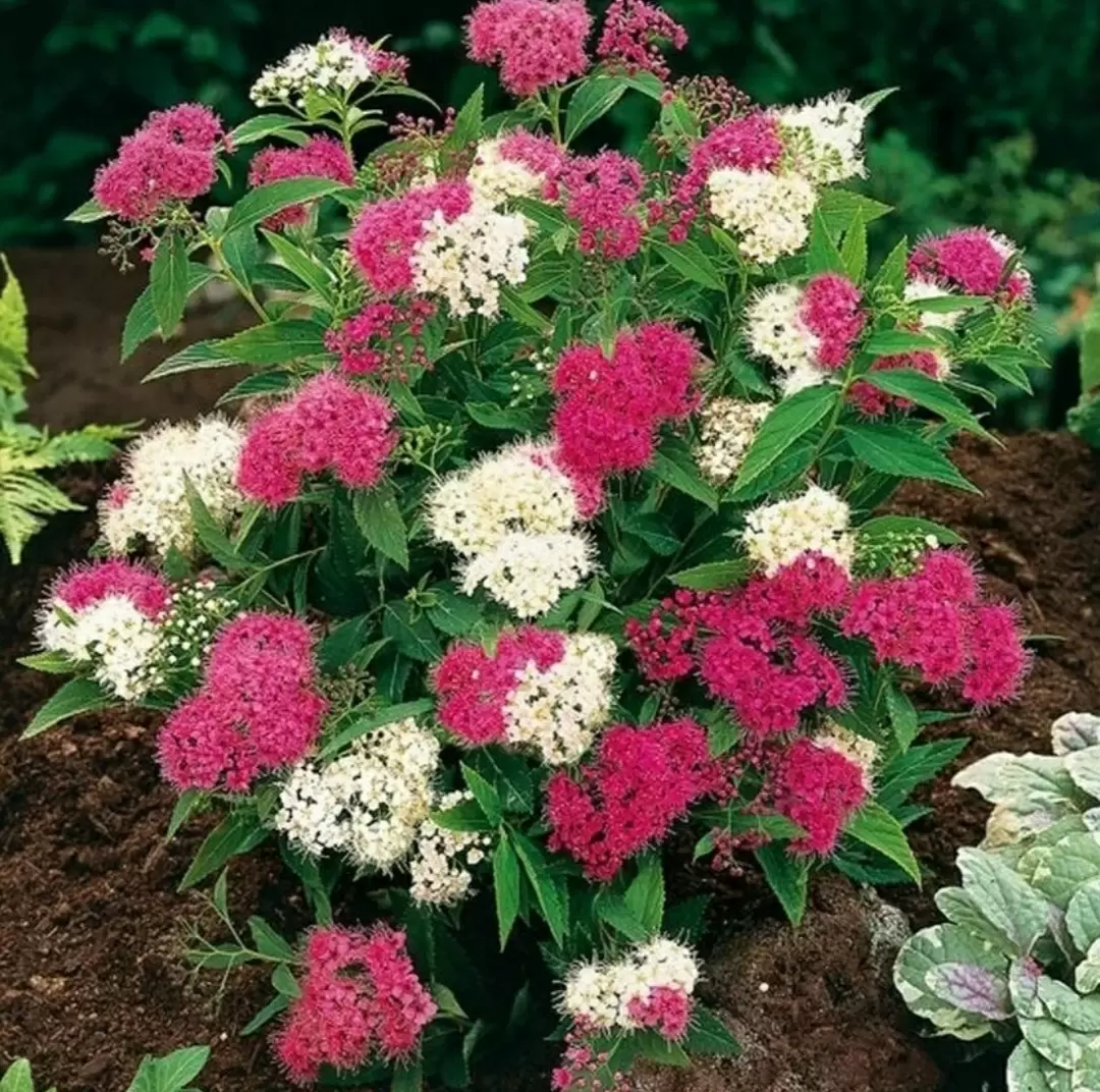 Эта низкорослая спирея (до 80 см) отличается темно-зелеными листьями с волшебными соцветиями, которые расцветают в июле. На одной растении можно увидеть цветки снежно-белые, нежно-розовые и насыщенно-лиловые — такая неординарная палитра сделала сорт Широбана очень популярным.