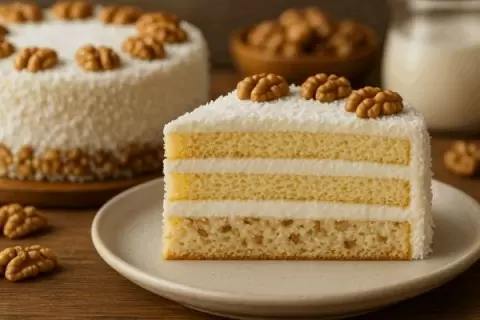 При сборке торта первый корж смазывают кремом, посыпают молотыми орехами и укладывают следующий слой. Завершив сборку, торт обмазывается кремом, посыпается кокосовой стружкой и украшен орехами. Поставьте готовый торт в холодильник на несколько часов, чтобы он как следует пропитался. Превратите десерт в настоящий шедевр, следуя этим простым шагам!