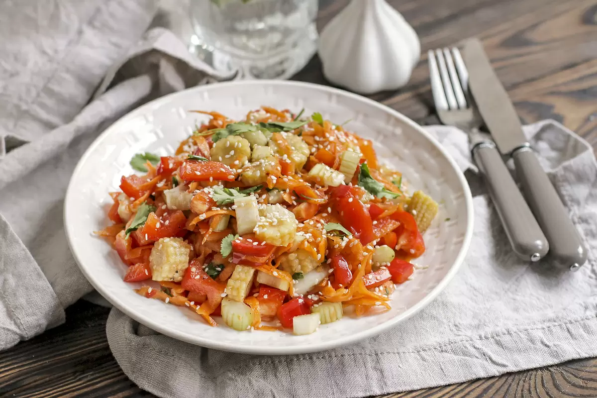 Соевый соус традиционно считается "восточным кетчупом" и занимает особое место в восточной гастрономии. Сегодняшний рецепт предлагает освежающий овощной салат в азиатском стиле с пикантной заправкой из сладкого соуса чили. Этот яркий и легкий вариант идеально подходит для ужина, совмещая хрустящие овощи и насыщенные вкусы.