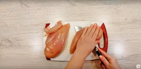Для начала необходимо подготовить куриное филе. Одной большой грудки вполне достаточно. Отделите малое филе, которое также можно использовать, а затем разрежьте большую грудку на две части вдоль.