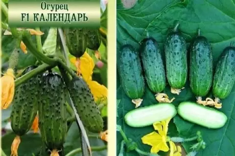 Растения Календаря имеют сильный рост и хорошую ветвистость. Их декоративные кусты дают исключительно женское цветение, что избавляет дачников от необходимости привлекать опылителей. Плоды формируются в гроздьях, с сортировкой по размеру и визуальным характеристикам — длиной от 8 до 10 см и диаметром 3-3,5 см. Кожица огурцов насыщенного зелёного цвета с характерными тёмными полосами и бугорками, что придаёт им привлекательный вид.