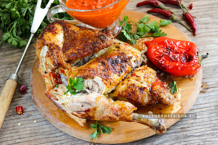Через полчаса, используя кисточку или веточку петрушки, смазать кожу курицы соусом. Запекайте еще 15 минут, увеличив температуру до 190-200 градусов. Цыпленок готов, когда мясо легко отделяется от кости, а кожа становится золотистой и хрустящей.